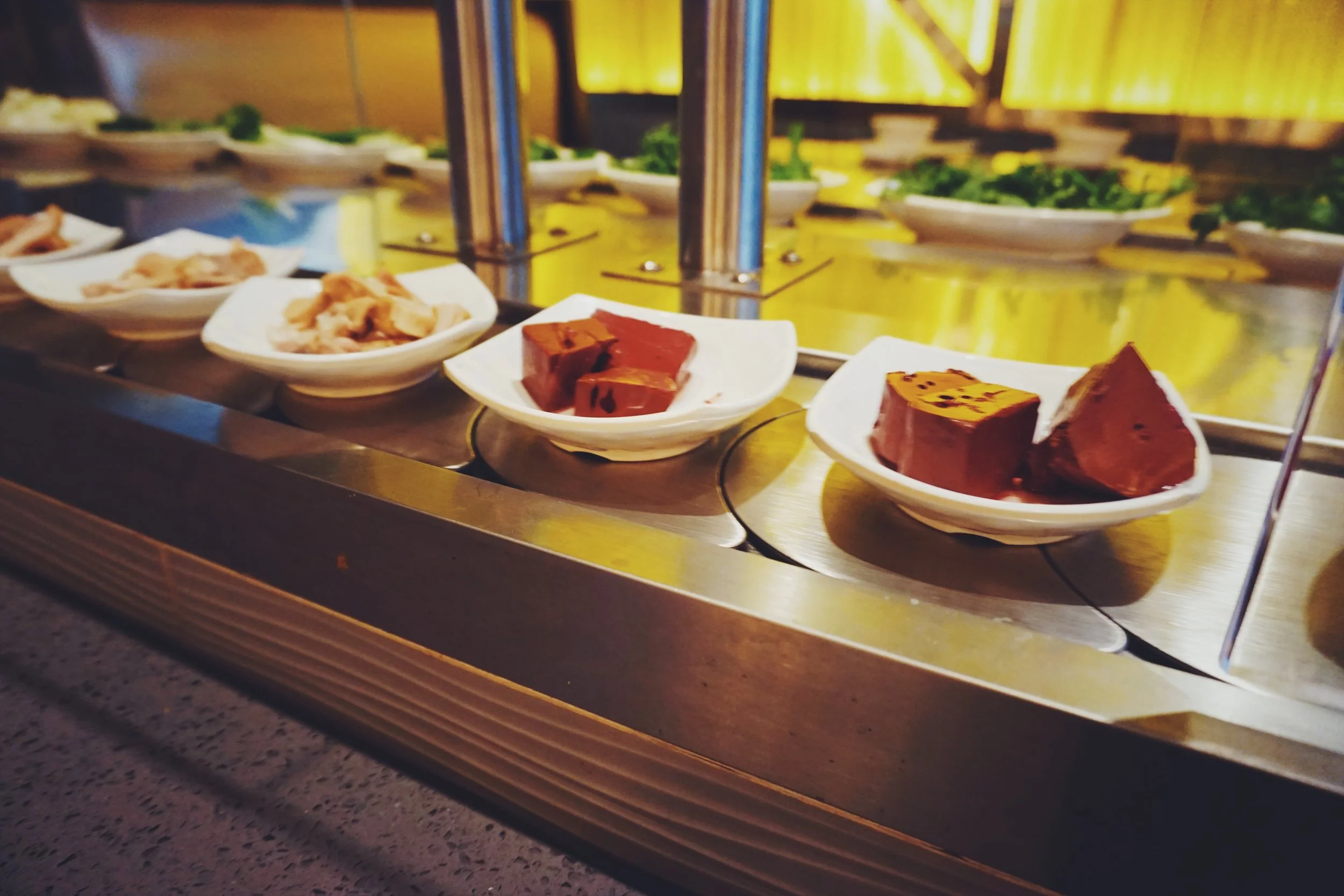 So they are a Chinese style hot pot restaurant that lets each patron get their own hot pot and you can take whatever you want from the small dishes coming down the belt.