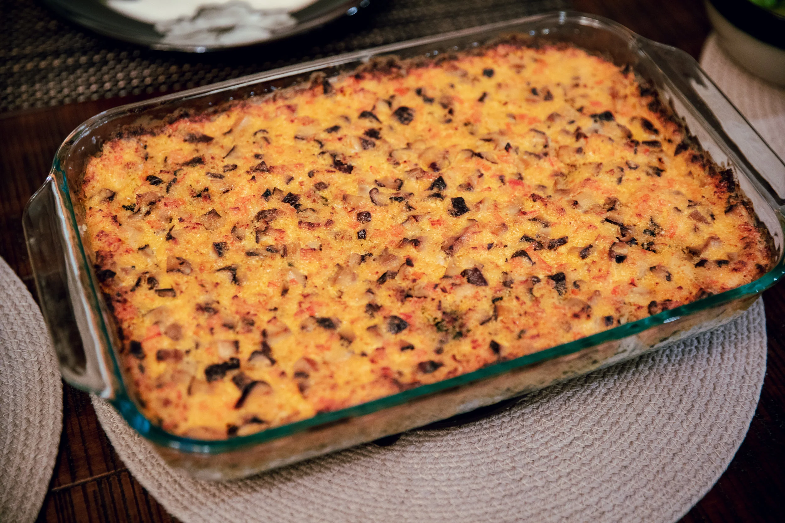 In a glass 9” x 12” pan add a layer of rice.