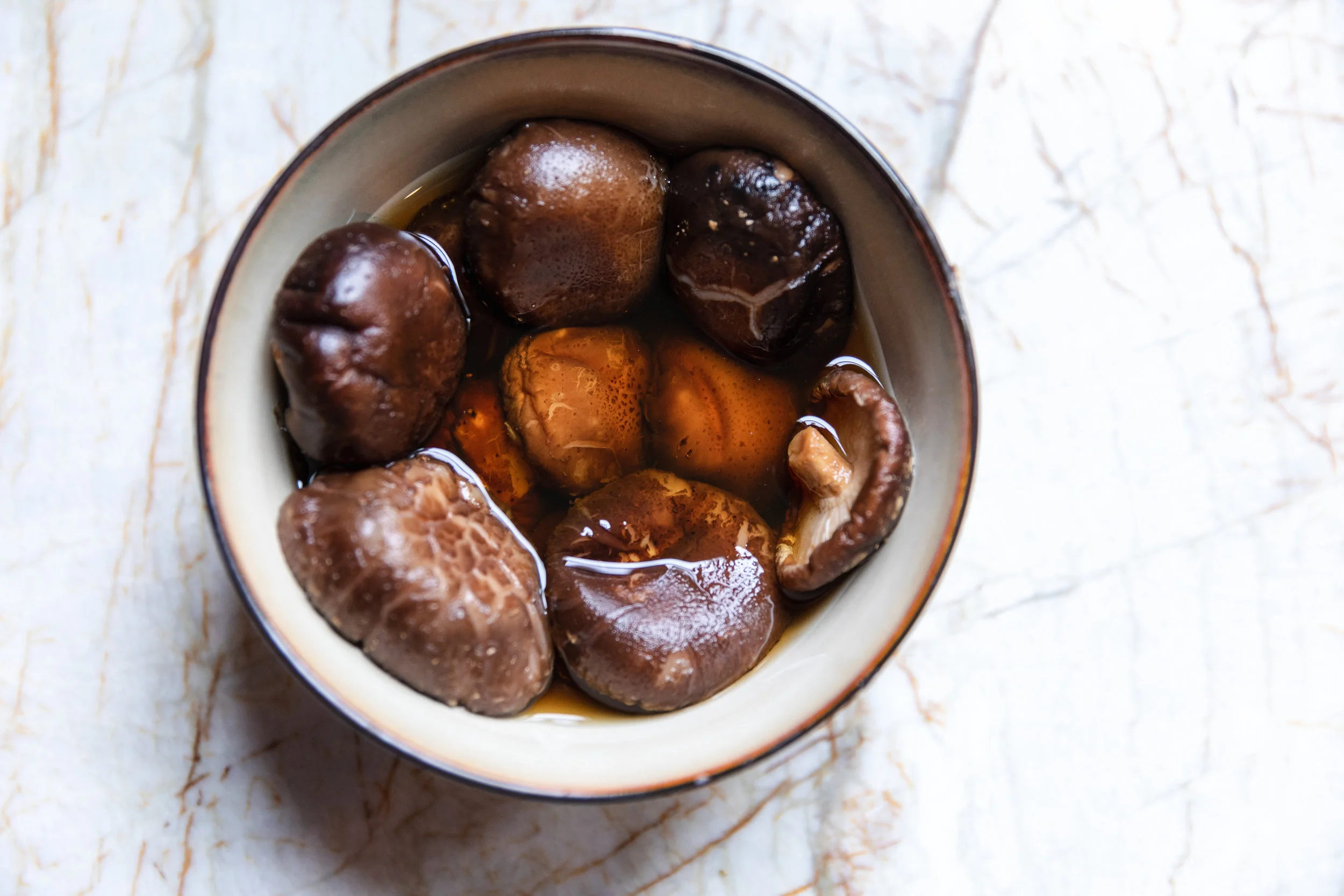 Soak dried shiitake mushrooms in water for 4 hours. I recommend soaking them overnight if you can. The longer the mushrooms soak the better.
