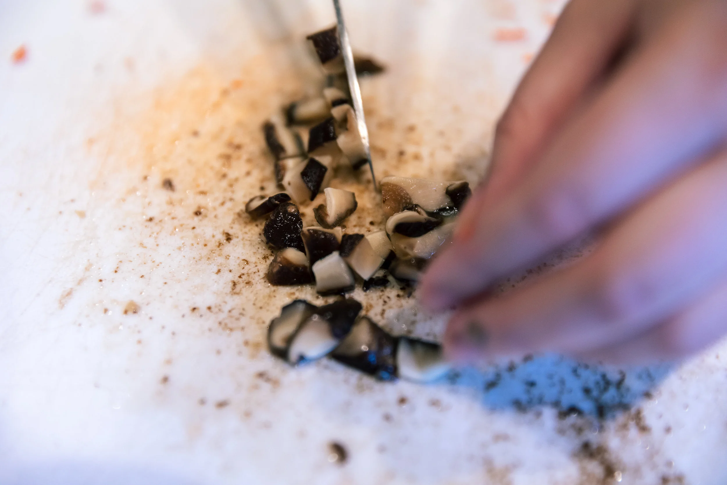 Remove shiitake mushrooms from water, and squeeze out excess water. Then finely chop and place the mushrooms into the bowl with the imitation crab.
