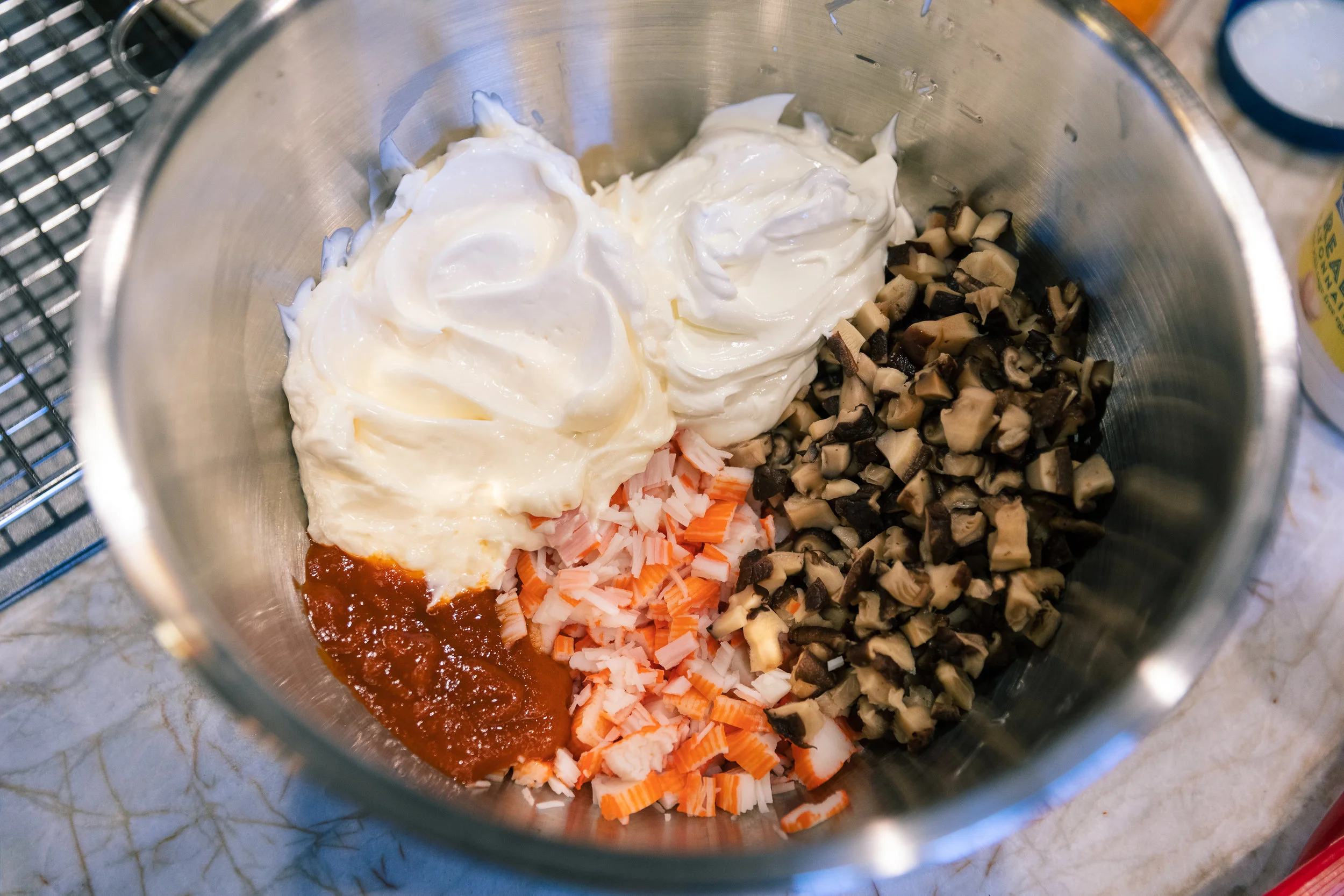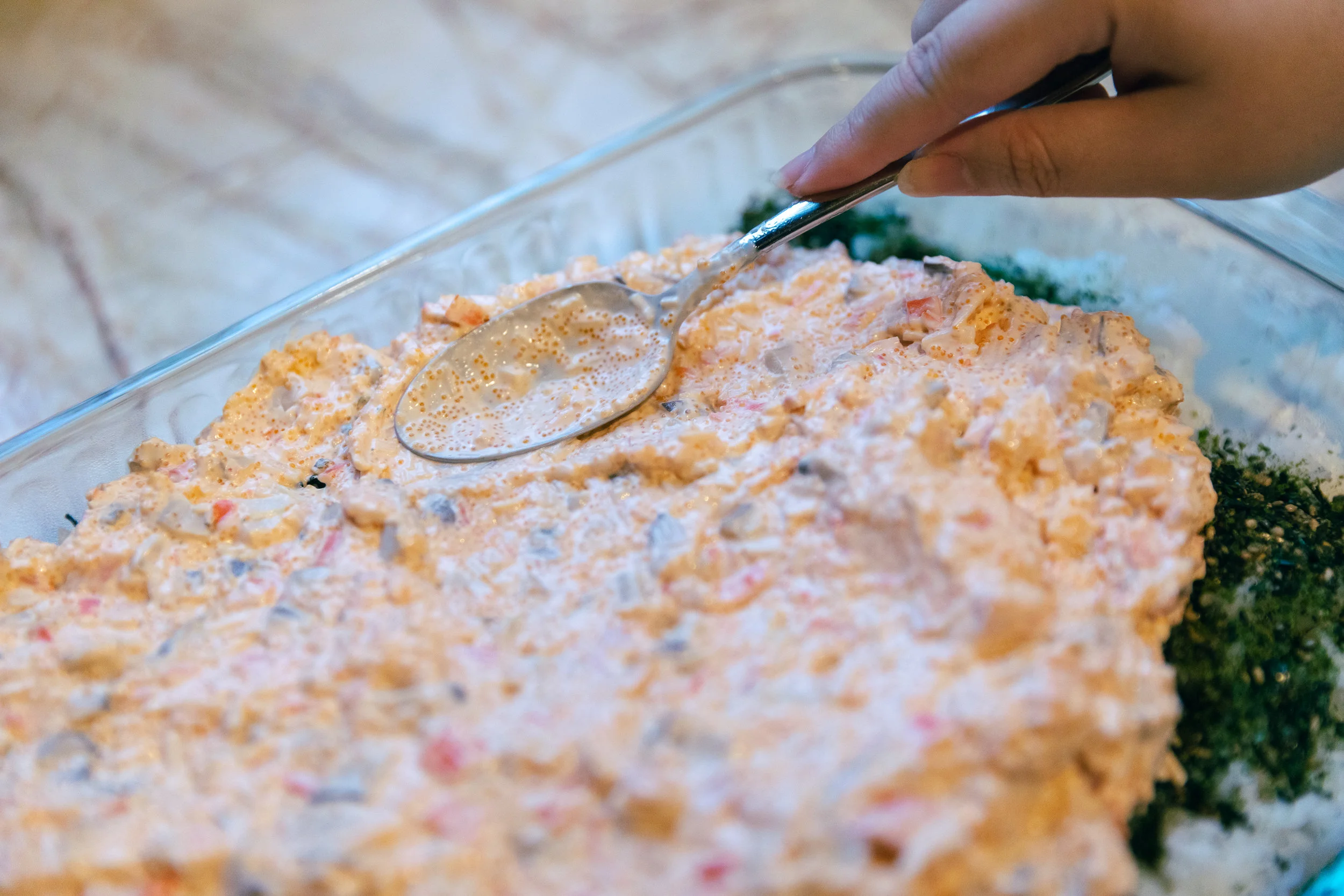 Add mayo, sour cream, sriracha and masago into the bowl and mix.