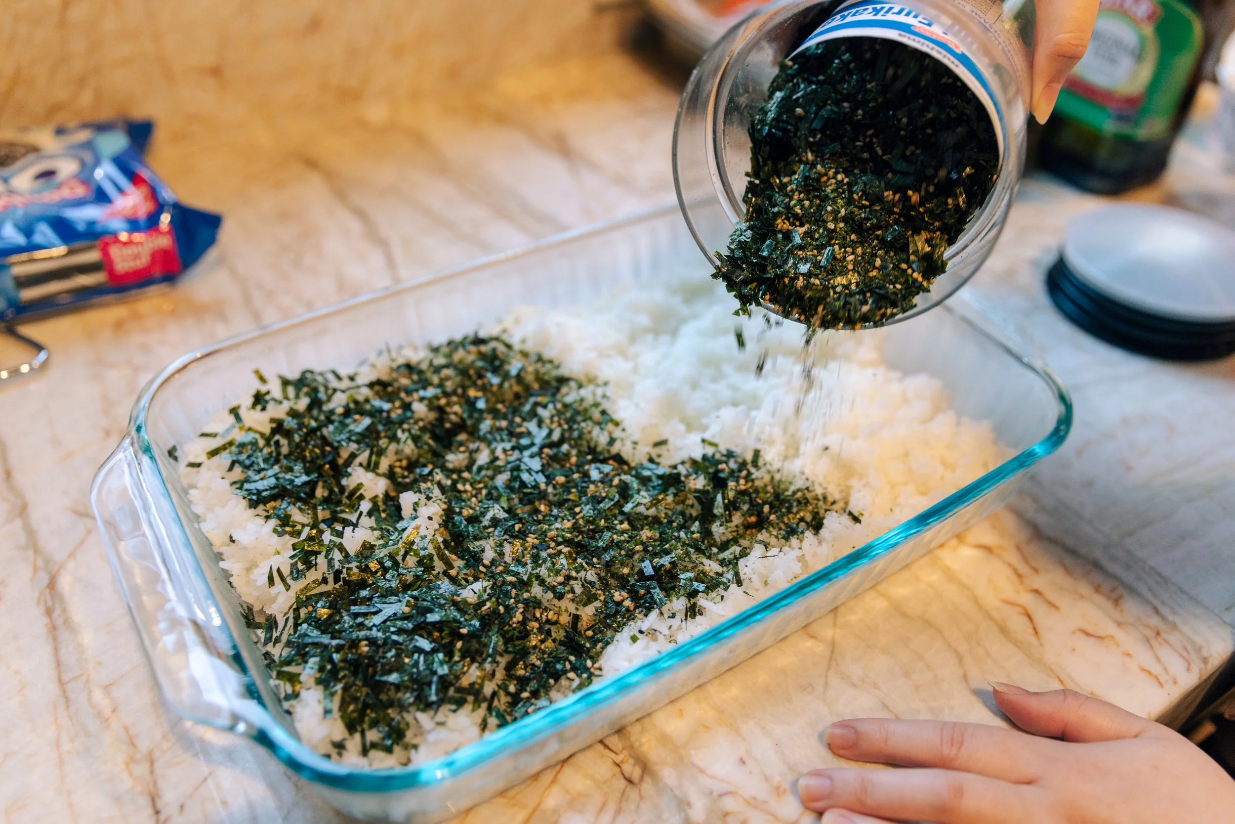 Sprinkle a light layer of furikake over the rice.